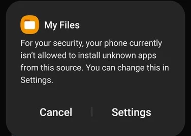 You’ll need to allow installing apps that did not come from Google Play. Tap “Settings” and allow “My Files” to install unknown apps.